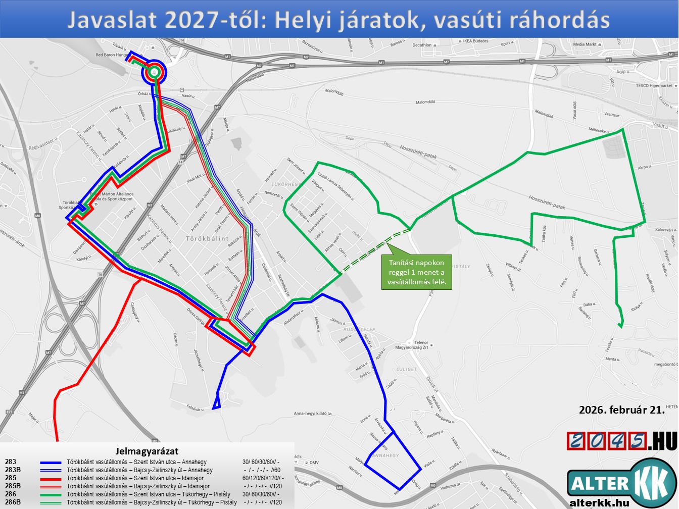 Az alternatív javaslat egyik legfontosabb előnye, hogy minden városrészből megmarad vagy javul az iskolák, rendelők, gyógyszertárak és a városközpont elérhetősége. A 283-as, 285-ös és 286-os viszonylatok új struktúrája logikus, átlátható, és a valós igényekhez igazodik — nem rombolja le a meglévő rendszert, hanem továbbfejleszti azt.