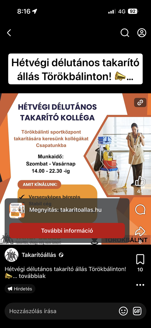 A Törökbálinti Sportközpontba takarítókat keres egy külsős, takarítással foglalkozó vállalkozás – délutános és éjszakai munkarendbe egyaránt. A hirdetés önmagában talán nem lenne különös, ám annál több kérdést vet fel, ha figyelembe vesszük: a városnak van saját Városgondnoksága, valamint egy 100%-ban önkormányzati tulajdonú üzemeltető cége is. Ezek a társaságok elvileg pontosan az ilyen feladatok ellátására jöttek létre.